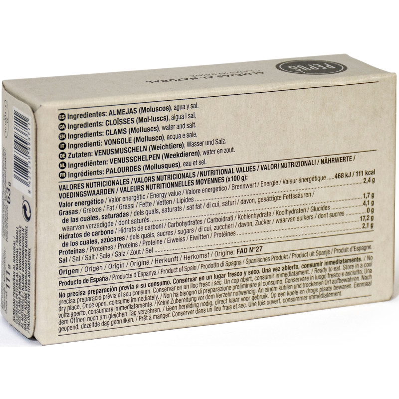 Las almejas Pepus se lavan y se cuecen al vapor en un proceso controlado. Se desconchan cuidadosamente y se clasifican por tamaño. Después de un último lavado se empacan y se añade el líquido de cobertura (agua y sal).