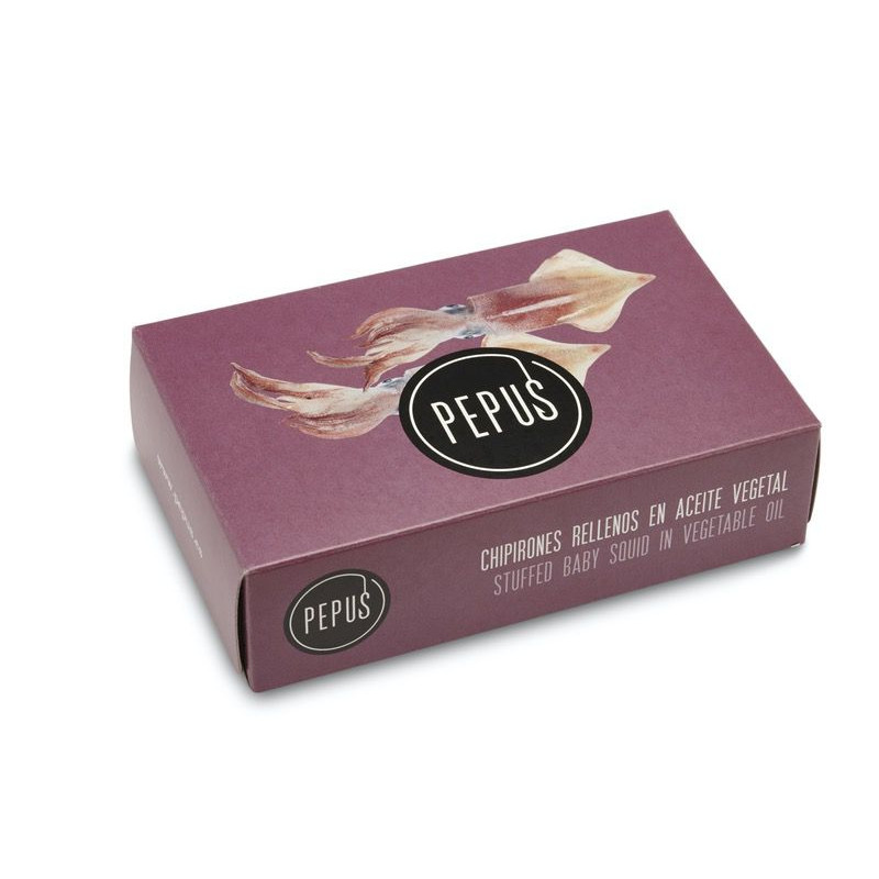 Los chipirones rellenos Pepus sorprenden por su sabor. Los chipirones (calamar) se cuecen y se rellenan con un preparado a base de surimi, arroz y cebolla. Posteriormente, se envasan y se añade el líquido de cobertura, aceite y especias.