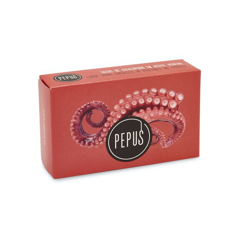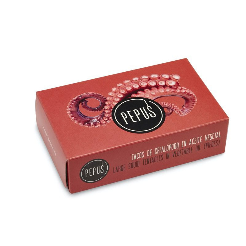 Los tacos de cefalópodo Pepus son rodajas de tentáculo de Pota del Pacífico. La pota es un tipo de calamar y, por tanto, tiene las mismas características organolépticas. Una vez se recibe el producto en las instalaciones, se lava y se cuece. Posteriormente se seleccionan los mejores rejos y se trocean. Finalmente, se envasa y se añade aceite vegetal como líquido de cobertura para potenciar su sabor.